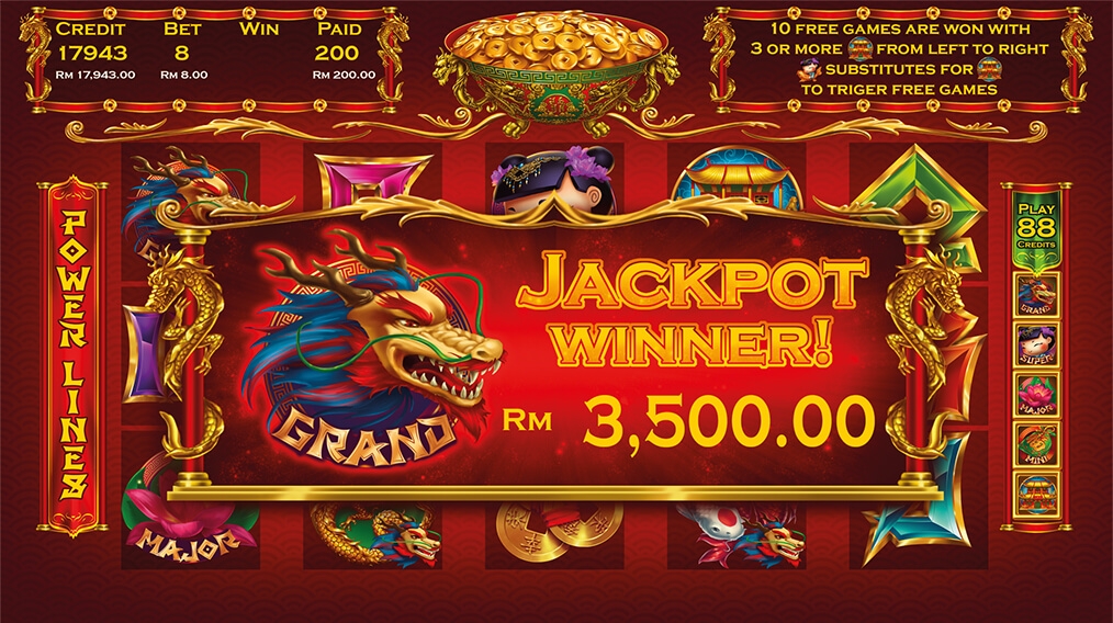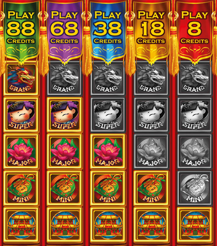 Dragon Legends is only available in the set of three cabinets with an integrated progressive Jackpot of four levels: Mini, Major, Super, Grand.